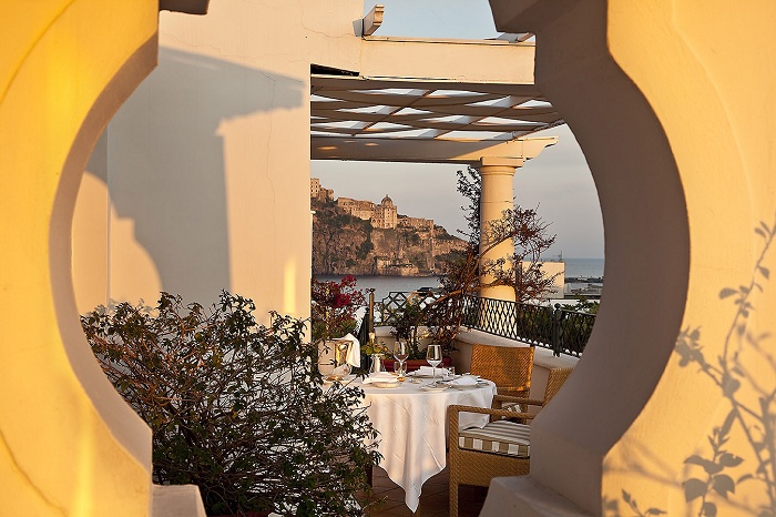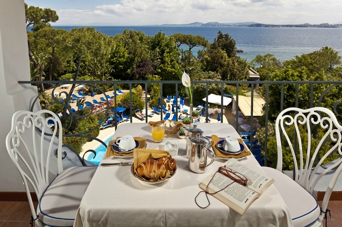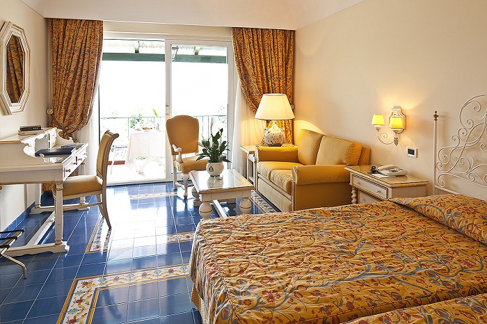 Suite (40 кв. м) - состоит из спальни, гостиной, гардеробной, ванной комнаты с джакузи, меблированной террасы. Вид на Арагонский замок, Капри и весь Неаполитанский залив.
