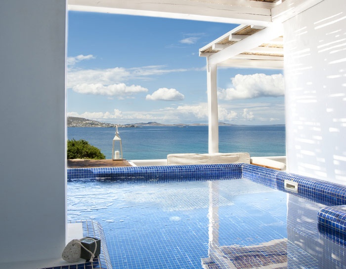 4 Deluxe Rooms with Plunge Pool (19 кв. м) - состоит из спальни с кроватью king-size, ванной комнаты, террасы с джакузи. Вид на море и остров Делос. Макс. размещение - 2 взрослых.