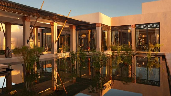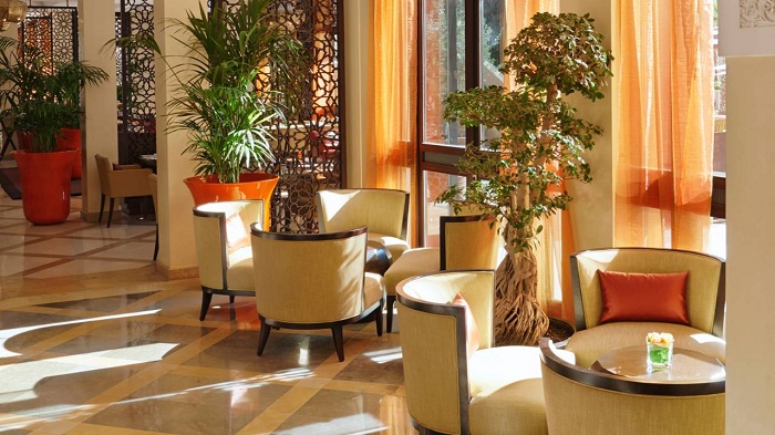 Номера выдержаны в светлых пастельных тонах и выполнены в элегантном современном стиле, который гармонично сочетается с местными традициями, украшениями из резного дерева и изящной марокканской плиткой. С балконов открывается прекраный вид на пышные сады и Атласские горы.