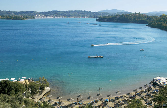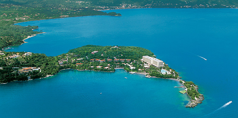в 10-ти км от исторического города Корфу (Керкира), на частном полуострове, с трех сторон окружен кристально чистыми голубыми водами Ионического моря.