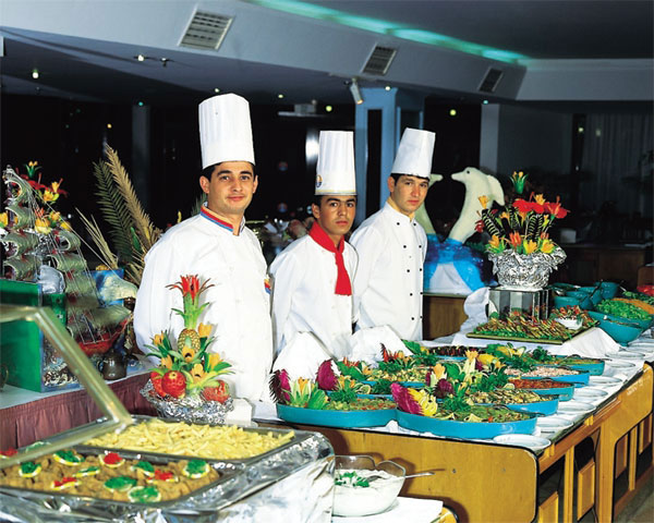 В основном ресторане Вам предложат завтрак со свежевыжатым апельсиновым соком, поздний завтрак, обед, в течение дня легкие закуски, ужин, поздний ужин. В отеле 5 а-ля карт ресторанов, в которых можно поужинать по предварительной резервации раз в неделю. В систему питания включены местные и некоторые импортные напитки (Whisky, Martini, Bacardi, Tequilla, Campari, столовое вино).