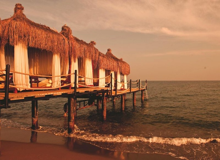 на берегу моря, в селе Кунду, в районе Аксу, в 28 км от Анталии, в 20 км от аэропорта Анталья.