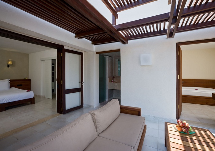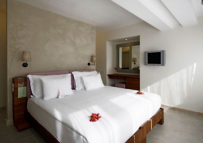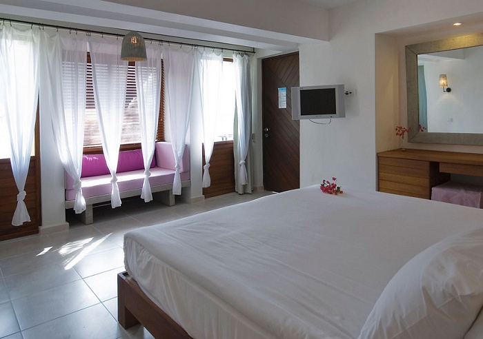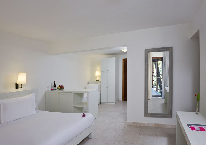 Номер категории Е (35 кв. м) - состоит из спальни, ванной комнаты с душевой кабиной, туалета, террасы с видом на море и территорию отеля. Макс. размещение – 3 взрослых.