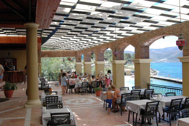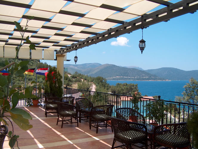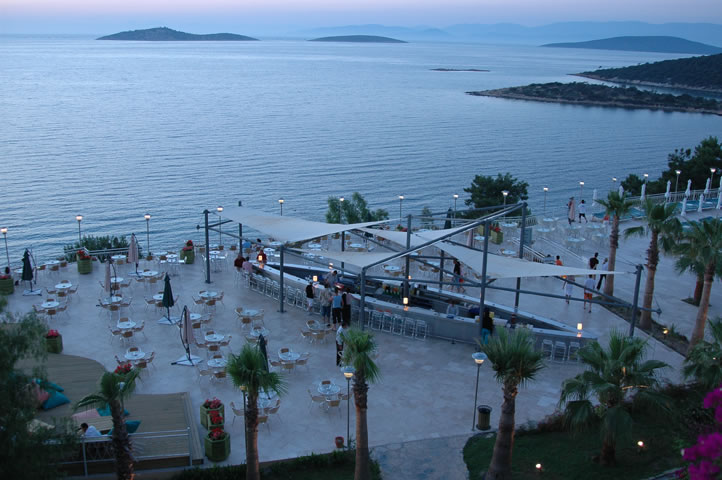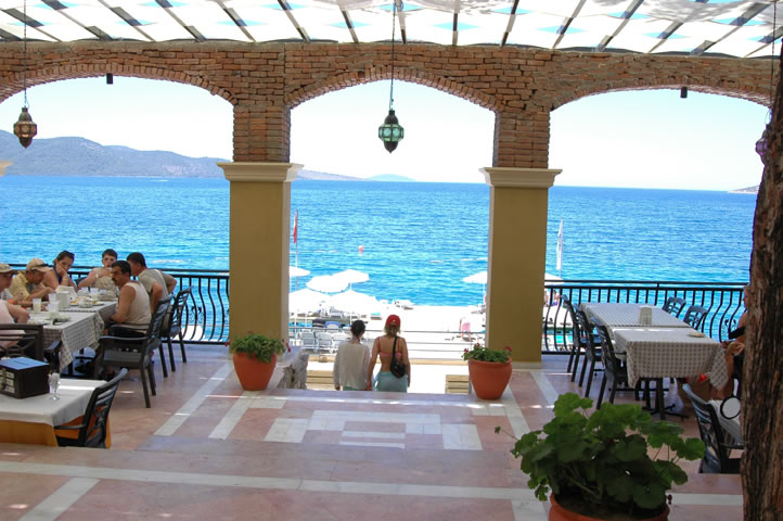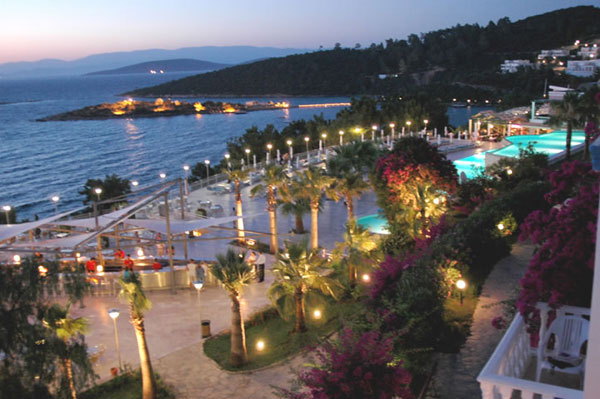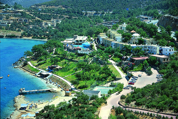 в 29 км от аэропорта и в 9 км от центра г. Бодрума, на самом берегу моря.