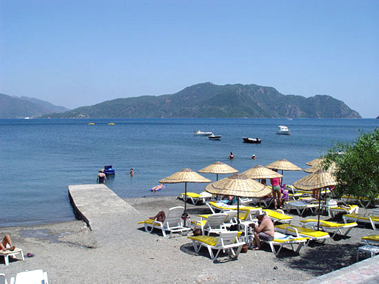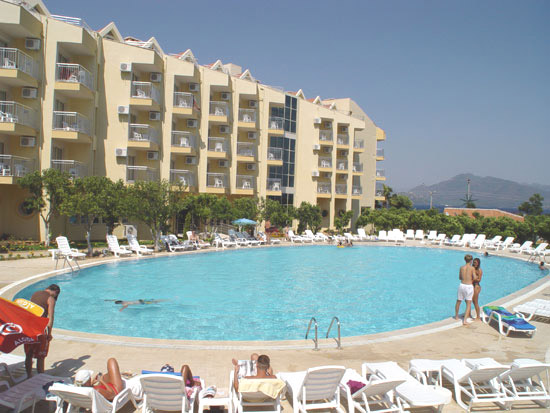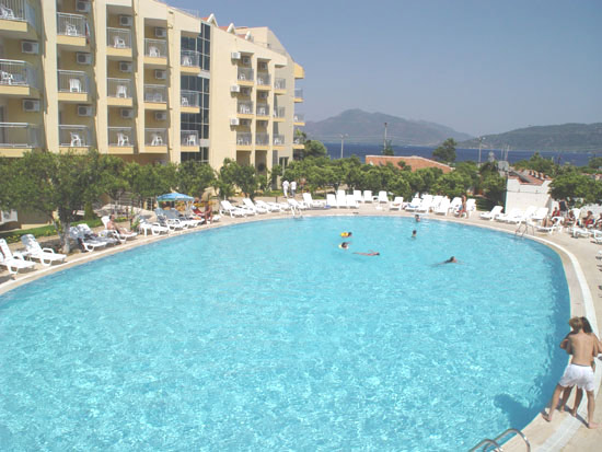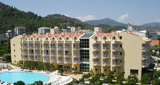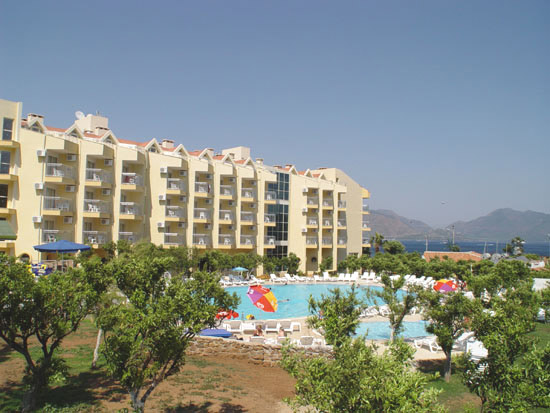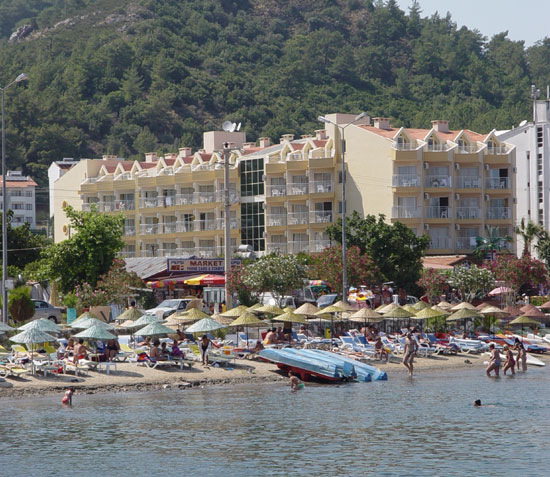 в 95 км от аэропорта г. Даламан, в 3 км от центра г. Мармарис, на самом берегу моря.Отель состоит из одного 5-ти этажного корпуса: