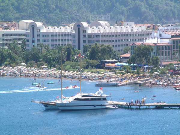 в 107 км от аэропорта г. Даламан, в 11 км от центра г. Мармарис, в 500 м от центра пос. Ичмелер, на самом берегу моря.