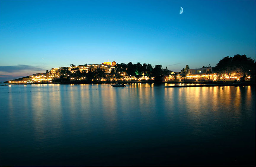 в 52 км от аэропорта и в 20 км от центра г. Бодрума, в 3 км от поселка Тургутреис, на самом берегу моря.