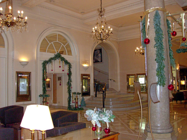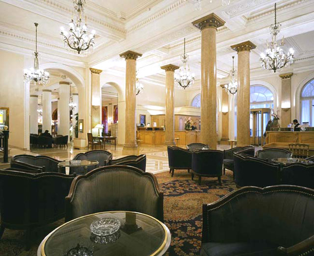 При входе знаменитый «Гранд-Салон» ослепляет торжественной роскошью убранства: драгоценным мрамором колонн с позолоченными капителями, потолочными фресками и великолепной лепниной.
