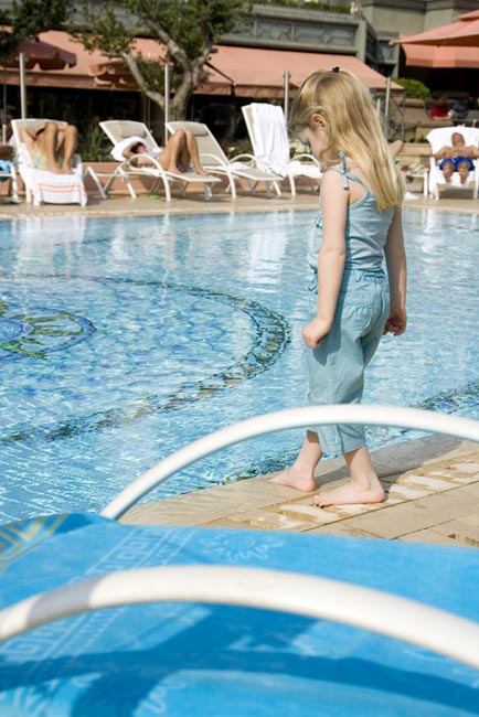 Бассейн с подогреваемой водой, выложенный плиткой Мурано, окруженный замечательной террасой – неотъемлемая часть настоящего отеля-курорта.