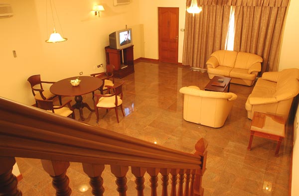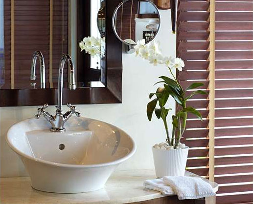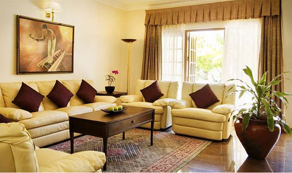 Интерьеры оформлены в светлых тонах, с использованием полированного дерева и ярких драпировок, с высокими деревянными потолками, отделанными мрамором и песчаником ванными комнатами.