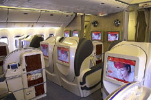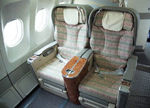 Просторный салон первого класса оформлен очень элегантно. Здесь органично сочетаются европейский уют и азиатская роскошь. Наслаждаться полетом пассажирам позволяют широкие и очень удобные кресла, которые откидываются на 38 см и расположены друг от друга на расстоянии 1,82 м. Каждое кресло снабжено подголовником, имеет подставку для отдыха ног и суппорт для поясницы. Любезные и приветливые стюардессы предложат Вам еше на земле шампанское, свежие фруктовые соки, минеральную воду «Перье», кофе и финики. Во время полета Вы сможете насладиться аперитивами, горячими и холодными канапе, а также обедом из семи блюд, приготовленным нашим опытным шеф-поваром, и широким ассортиментом вин. К Вашим услугам: |