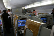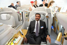 Для пассажиров первого и бизнес классов Emirates предлагает услугу сопровождения на автомобиле представительского класса с водителем. Отдельные купе первого класса авиалайнеров Emirates оборудованы отдельным местом для хранения багажа, шкафом для одежды, туалетным столиком и персональным мини-баром. Большие кресла повышенной комфортности полностью раскладываются в кровать, а на 23-дюймовом жидкокристаллическом экране демонстрируются более 600 каналов мультимедийной развлекательной системы ice. Пульт управления позволяет пассажиру выбирать индивидуальные параметры для комфорта, от положения кресла до выбора фильма. |