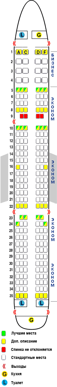 5-35 ряды Класс: Эконом Тип кресла: Standart Видео: Описание: Кресла в 9 ряду имеют меньшую возможность отклонения, так как находятся перед выходом, они уже, чем обычные, а также в данном ряду отсутствуют окна. Все остальные ряды оборудованы стандартными местами экономического класса.