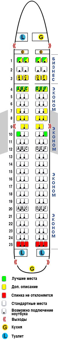 4-25 ряды Класс: Эконом Тип кресла: Standart Видео:- Описание: Страндартные места экономического класса. Ряд 4. Места с увеличенным пространством перед креслом. Столики для питания крепятся на подлокотники. Ряд 10, места A,F. Места с увеличенным пространством перед креслом. Столики для питания крепятся на подлокотники. Ряд 25 - Ограничение наклона спинки кресла.