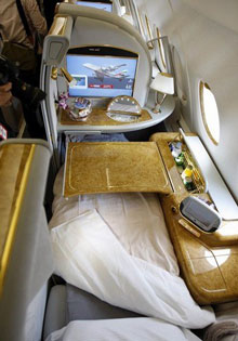 Для пассажиров первого и бизнес классов Emirates предлагает услугу сопровождения на автомобиле представительского класса с водителем. Отдельные купе первого класса авиалайнеров Emirates оборудованы отдельным местом для хранения багажа, шкафом для одежды, туалетным столиком и персональным мини-баром. Большие кресла повышенной комфортности полностью раскладываются в кровать, а на 23-дюймовом жидкокристаллическом экране демонстрируются более 600 каналов мультимедийной развлекательной системы ice. Пульт управления позволяет пассажиру выбирать индивидуальные параметры для комфорта, от положения кресла до выбора фильма. |